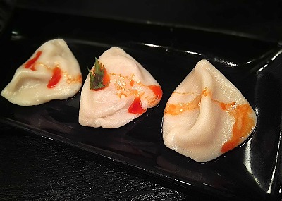 カウンター席で待つこと数分、まずは水餃子から着皿。小籠包みたいな小さな餃子が3つ、黒い皿に乗っています。香味の効いた特製のつけダレでいただくと、