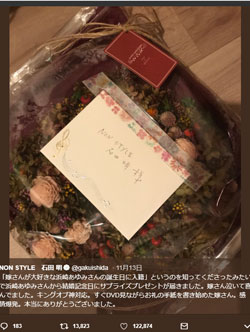 石田は11月13日に更新したTwitterで、「『嫁さんが大好きな浜崎あゆみさんの誕生日に入籍』というのを知ってくださったみたいで浜崎あゆみさんから結婚記念日にサプライズプレゼントが届きました」と、浜崎からお祝いの品をもらったことを報告。画像も数枚投稿されており、そこには浜崎のものと思われる直筆メッセージとともにクリスマスリースが写っていた。