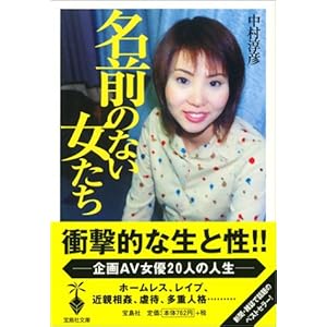 発売されてすぐに原作本を購入したが、原作者・中村氏がセレクトした企画女優たちの精神病歴、自傷歴のあまりのすさまじさに、途中でページをめくる手が止まってしまった覚えがある。小学生時代の大半をホームレスとして過ごした女、セックス依存症で多重人格の女、引きこもりでリスカ癖のある女、有名企業に勤めていたが借金返済のために夫に内緒で出演を続ける主婦……。さらに『名前のない女たち最終章』では中学時代の3年間、実の父親から性的虐待を受け続けたという超弩級のDV体験者も登場する。飯島愛のようなタレントになることを夢想する若い子もいるが、中村氏は断言する。「飯島愛はタレントとしての才能があったから成功したのであって、過去にAV女優だったこととはなんの関係もない」と。それでも男たちのバーチャルな欲望を満たすため、AVの世界に足を踏み入れる女性は後を絶たない。市場規模1,000億円と推定されるAV業界で、年間にリリースされる作品数は2万本。AV女優として働く女性たちの数は、年間でおよそ1万人と言われている。そのうち95%が”企画女優”なのだ。