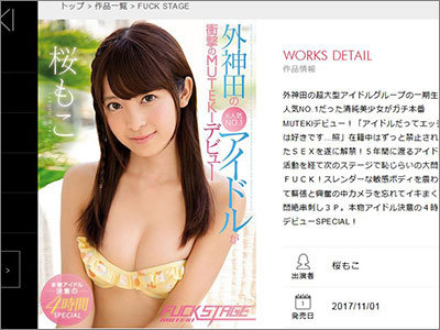 つんく♂がプロデュースする人気アイドルグループで中心メンバーとして活動していた桜もこが、11月に『FUCK STAGE』(MUTEKI)でAVデビューするという。