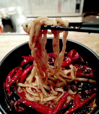スープだけでなく、もちろん麺にもたっぷり唐辛子をまとわせて、一気にズズッとすすりあげてみた。たが、むせる気配も感じない。