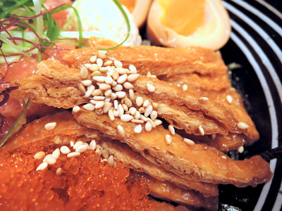 その下にあるのは白ゴマの乗った細切りの油揚げ。だし汁が染みている。