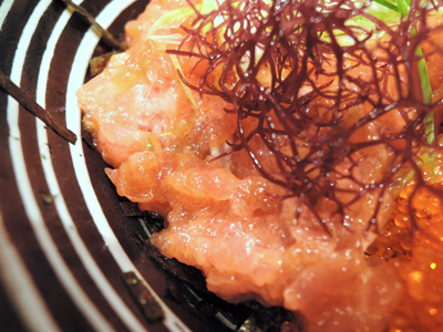 そして、9時の方向にたっぷり盛られているのは、マグロの中落ち。こりゃうまそうだ。その他、つくねにネギ、海藻が乗っかっているその下にあったのは……、