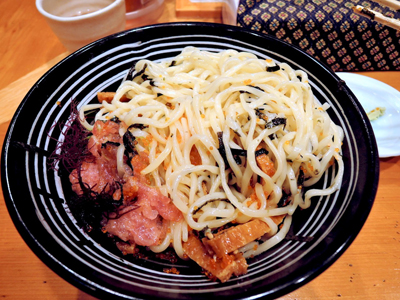 綺麗に盛り付けられた麺を、店主が言う通り、丼の下にあるタレを持ち上げるように、よく混ぜ、混ぜ、混ぜると、中落ちもとびっこも海苔も一緒くたに麺に絡まってくる。