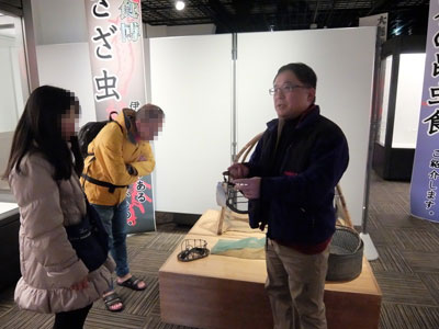 この企画展を立案した館長の捧(ささげ)剛太さんも、やはり昆虫食を探求中。この企画に当たっては「カンボジアで売っているタランチュラのフライを買ってきてもらって食べたのですが、美味い!!」という。その探究心はとどまるところを知らず、現在、毎日のように「ざざ虫のピザ」「イナゴとざざ虫と蜂の子のパスタ」「虫の軍艦巻き」などの新メニューを考案中だ。