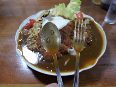 と、ふたつめのスプーンを手に取ると、それはスプーンではなくフォーク。なるほど、大きなチキンカツは、スプーンでは食べにくいのでフォークが付き添いというわけか……。