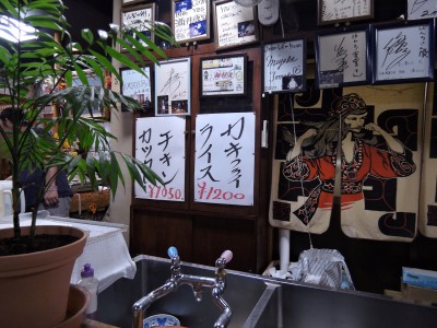 おばあちゃん店員さんにチキンカツカレーを注文してから店内を見回すと、カウンターの中には、たくさんのサイン色紙が飾られていることに気づいた。そして目の前には、大きく「チキンカツカレー」と書かれた白い紙が貼られている。ということは、店の名物かお勧めメニューに違いない。さすが、チキンカツカレーである。