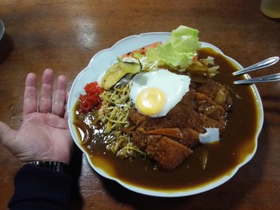 想像してほしい。筆者の手は、男性としては大きくも小さくもないミドルサイズ。その掌の大きさから、このチキンカツカレーの量を! 軽く3人前くらいはありそうだ。