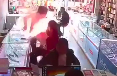 男が椅子に座り、ガラスケースの上で工具を使ってスマホからバッテリーを取り出そうとしていると、いきなり火を噴き、炎が男の顔を襲った。