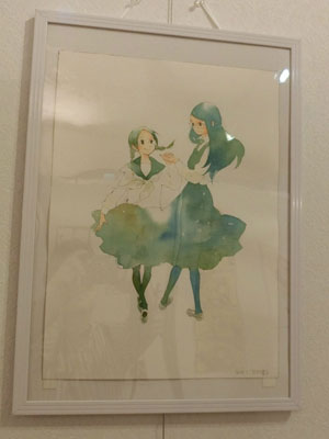 展示は、百合作品の原画やイラストが中心となっている。あいうえお順で、雨隠ギドの『終電にはかえします』、伊藤ハチ『月が綺麗ですね』などが並び、早くも百合の世界にいざなってくれる。