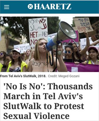 2011年、カナダのトロントで、「性犯罪に遭いたくなければ、女性はヤリマン(スラット)のような服装は慎むべきだ」と警察官が発言したことに反発した現地の女性たちによって始められたこの「スラットウォーク(SlutWalk)」だが、その後各国へと伝播。「レイプされる側にも落ち度がある」といった偏見や、女性の服装の自由を訴える目的で、これまでにロンドンやパリ、サンパウロ、シンガポールなどの世界の主要都市で開催されてきた。11年以来、毎年スラットウォークが開催されてきたテルアビブは近年、各開催地の中でも最大級の盛り上がりを見せており、全裸に近い格好で参加する女性も少なくない。