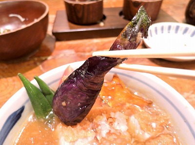 その時のためにスタンバッテいるのがチーム夏野菜の面々。煮びたしのナスは意外に大きくて、甘辛い汁がたっぷり。オクラも歯ごたえバツグンだった。