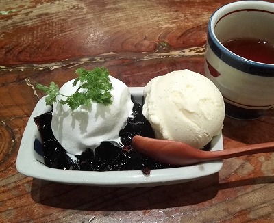 食後に予想外の辛さにシビレきった舌を癒すのは、ビールよりデザートがベター。コーヒーゼリーのほろ苦さとバニラアイスの甘さが一段と際立つ瞬間だ。