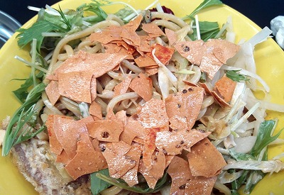 そしてさらには、最初に別皿に取り分けておいた、あのおせんべいをパリパリっと砕いてトッピング~!