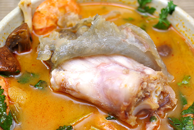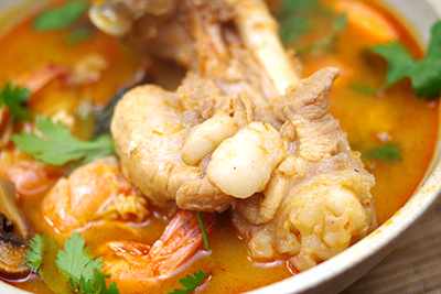 追加の具としてエビ、マッシュルーム、小松菜を入れて、軽く煮たらできあがり。仕上げにパクチーをたっぷりと乗せよう。