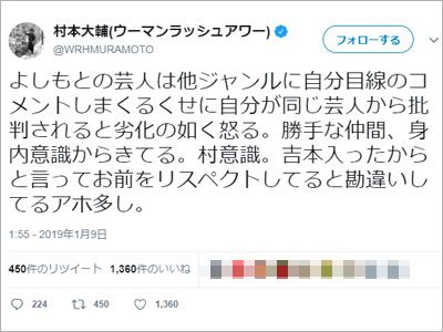 村本は「よしもとの芸人は他ジャンルに自分目線のコメントしまくるくせに自分が同じ芸人から批判されると劣化の如く怒る」とした上で「勝手な仲間、身内意識からきてる。村意識。吉本入ったからと言ってお前をリスペクトしてると勘違いしてるアホ多し」とツイート。さらに「会社は尊敬してる芸人がいるから入ったのではなく、劇場の数とか、そういう計算のほうが強い。それなのに入った瞬間からタバコ買いに行かされる謎。そもそも、お前になら勝てると思って入ったんだが。。」と切り捨てた。