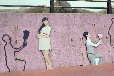 巨大南京錠に近づくにつれて、やはり愛をモチーフにした飾りが少しずつ増えてきた。「LOVE」という形のどこかで見たような石像や、ハート形のベンチ、プロポーズを受けているような写真が撮れるトリックアートと、とってつけたようなアイテムが並ぶ堤防を先に進むと、ついに南京錠の前にたどり着いた。その大きさ、2階建ての建物ほどはあるだろうか。確かにでかい!