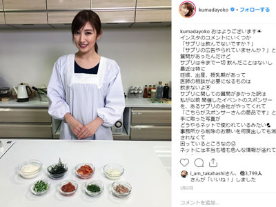 タレントの熊田曜子が1月28日、Instagramを更新。自身がインフルエンザに感染したことを明かした。