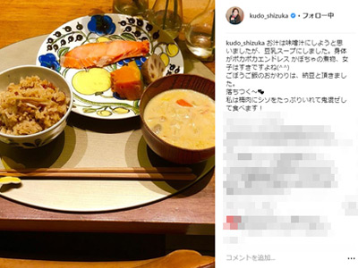 この日、「お汁は味噌汁にしようと思いましたが、豆乳スープにしました。身体がポカポカエンドレス かぼちゃの煮物、女子はすきですよね(^^)」(原文ママ)というメッセージとともに、テーブルに並ぶ手料理写真を公開した工藤。ごぼうご飯に豆乳スープ、おかずは焼き鮭、カボチャとレンコンの煮物という和食御膳。しかし、この中の“ある料理”に、ネット上ではブーイングが巻き起こった。
