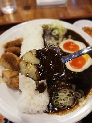 が、カレーの味そのものは特にスパイシーということもなく、ルゥ自体の濃厚さにチーズのまろみとコクが加わり、白いご飯との相性は抜群。さらに、味付け玉子にカツが付き、女性なら食べきれないかもしれないほどの大満足なボリューム感である。