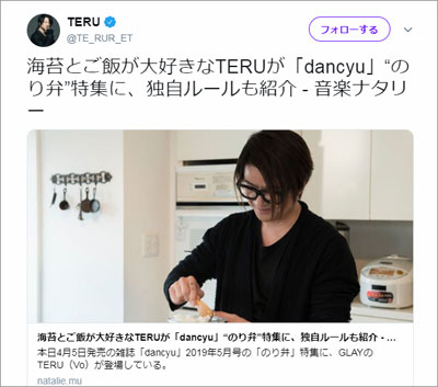 TERUののり弁愛はファンには知られたところで、満を持しての「Dancyu」登場に喜びの声が多数上がっているが、一部では「海苔が買えないって……」「これは笑えるだろ」「最近、ネタ案件多すぎ」といったツッコミの声も上がっている。
