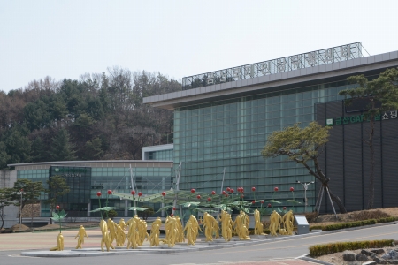 2006年の世界人参エキスポを記念して作られたオブジェ ゴージャスな建物は、エキスポのメイン会場となった錦山国際人参総合流通センター(なお、現在は使用されていないとのこと)。その前方に金色の何かが……