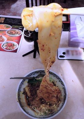 再び腰掛け、からそうなタレが満遍なくついた1本麺をほおばり、ズズッとすすりあげると、あげると……、あげ、られない。1本というか1枚というか、幅広で肉厚の麺が重くて、口の吸引力では啜り上げることができないのだ。