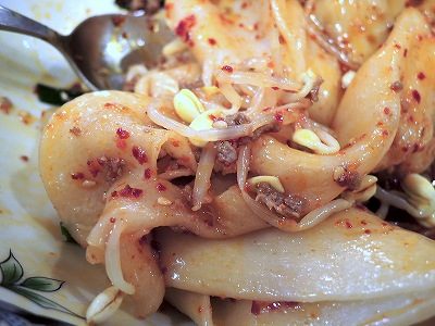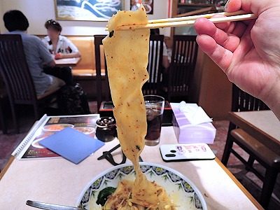 仕方なく、麺をたぐっては食い、食ってはたぐる。辛さは、期待したほど刺激的ではなく、ピリ辛以下という感じ。ひょっとしたら中国人女将が、辛味を弱めてくれたのかもしれない。タレも甘辛くて、麺の弾力もほどよい。