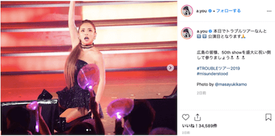 そんな浜崎がこの日の投稿で「本日でトラブルツアーなんと50公演目となります 広島の皆様、50th showを盛大に祝い倒して参りましょう」とつづり、ステージ上の写真を公開した。