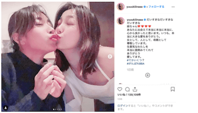 そんな木下が13日に「だいすきなだいすきなだいすきな姉ちゃん あなたに出会えて本当に本当に本当に、心から良かったと思います。いつも、本当に大きな愛をありがとう。女として、人として、母親として尊敬しています。生意気なわたしを本当に面倒みてくれてありがとう愛してます。」とつづり、タレントで歌手の鈴木紗理奈とキスをしている密着写真を披露した。