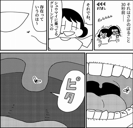 なぜそんなことになったかというと、しゃべってる間に、のどちんこにコバエみたいな虫が張り付いたのです。なるほど、これは確率的に、かなりレアなアクシデント!
