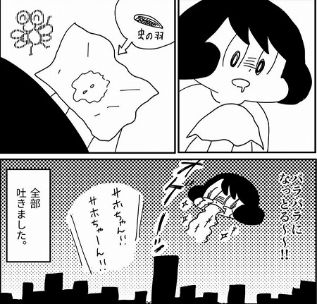 ティッシュにゲーしたら、虫の羽根だけが出てきて、さらにオゲーッてなるというオチでした。ただ、それだけのお話。この日常ネタ感……でも、なぜかすごくインパクトありますよね。日常エッセイなのにこの疾走感、尋常じゃありません。