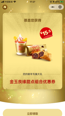 さらに同セットの特典として、ルーレットゲームにチャレンジすることができる。レシートに印刷されたQRコードを読み込むと、中国版LINE「WeChat(微信)」を通じてゲームページへ誘導される。購入金額35元(約560円) ごとに1回できるため、3回挑戦したが、いずれも同じデザートの割引券だった。盤面の半分近くを無料券が占めているが、本当に当たるのかは怪しい……。
