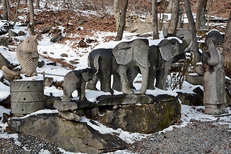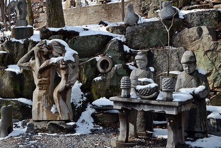 観光客もおらず、静まりかえった渓谷の坂道を登っていく。奥に進むにつれ、石を高く積んだ石塔、十二支や地蔵など民俗的な石像を筆頭に、ブタさんやカエルさんなどキュートな石像や、時空がゆがんだようなアートな石像まで、フリーダムな展示物が続々と現れてきた。