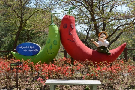 森の中の散策コースを進むにつれ、やはりトウガラシに関連したオブジェや看板が続々と登場。あまりにトウガラシすぎる景色にいちいち感想すら抱かなくなってきたころ、湖のほとりが見えた。そこには巨大なトウガラシが、つり橋の支柱として堂々とそそり立っていたのだった。