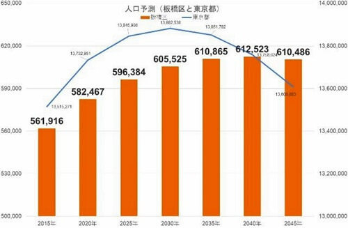 次に、国立社会保障・人口問題研究所の推計のデータを基に板橋区と東京都全体の今後の人口の予測を見ると、東京都全体の人口は2030年までに約12万人増え、その後は減少傾向に入ると予想されています。一方、板橋区は2040年まで約3万人増え、その後は減少傾向に入ると予想されており、今後、20年間は緩やかな増加傾向にあります。