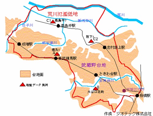 今回見た上板橋駅周辺の不動産価格は、コロナ禍による郊外ターミナル駅への移住を求める影響が今後出てくる可能性がありつつも、上記図面のようにときわ台から東武練馬エリアは台地面にあり、海抜高度が高く、起伏の少ない平坦面になっています。関東ローム層と呼ばれる火山灰土で覆われ、自然堆積したローム土は、安定しており比較的大きな強度が期待でき、表土部分に注意すれば住宅地盤として良好な場合があります。