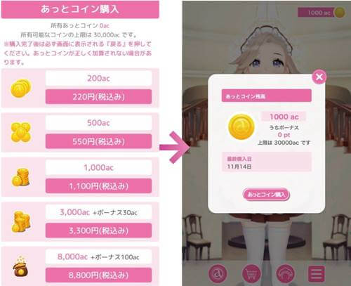 そして、いよいよ本編が始まる。ログイン後、最初に出てくるのはロビー画面。このロビー画面で最初に行うことは、「バーチャルあっとほぉーむカフェ」で使える通貨「あっとコイン(ac)」の購入だ。バーチャルメイドさんたちとのコミュニケーションを楽しむには、このコインが必要。