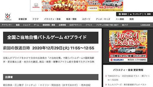 『全国ご当地自慢バトルゲーム 47プライド』(フジテレビ系)が12月29日に放送され、視聴者から批判の声が集まっている。