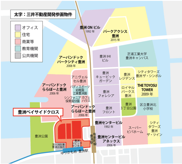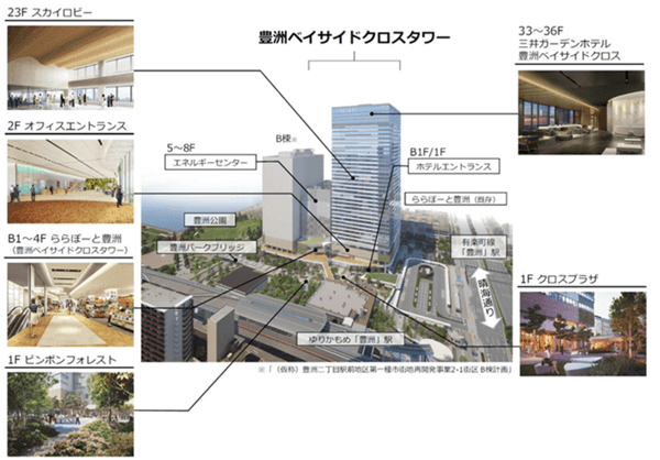 さらに、豊洲二丁目駅前地区で、三井不動産株式会社が再開発を現在進行形で進めています。具体的には、街区名を「豊洲ベイサイドクロス」と命名し、最先端の機能を兼ね備えたオフィスゾーンやバラエティ豊かな商業施設など、一層街の魅力が高まる「豊洲ベイサイドクロスタワー」が20年8月に開業しました。