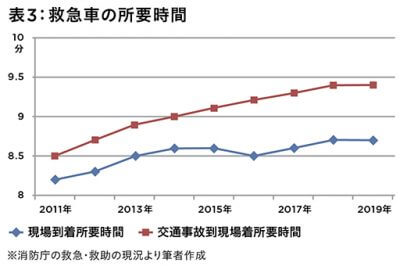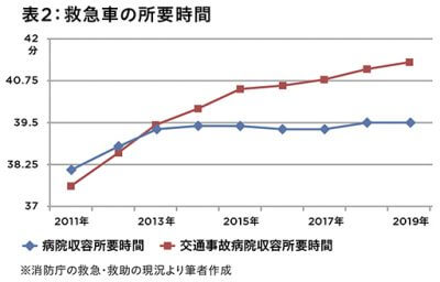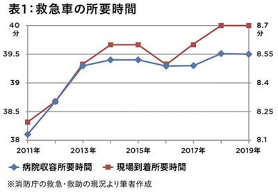 消防庁の「救急・救助の現状」によると、救急車の所要時間は、2019年で現場到着所要時間が8.7分、病院収容所要時間が39.5分となっている。近年の傾向は表1のように2013年に所要時間が増えた後は、現場到着所要時間は8分台半ば、病院収容所要時間が39分台半ばで、ジリジリと時間が増加している。