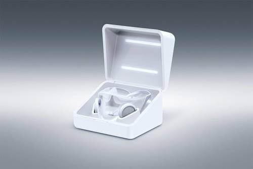 こういった機能があるため、本製品には充電が必要になる。専用ケースが用意されており、マスク本体をこのケースに入れることで充電が可能。専用ケースには殺菌機能もあるという。