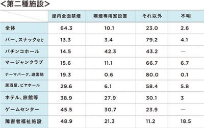 特にバー、スナックなどでは全面禁煙は13.3%、喫煙専用室設置が3.4%、それ以外が79.2%と8割近い店は全面禁煙を実施していない。また、パチンコホールでは屋内全面禁煙は14.5%の実施で、喫煙専用室設置が42.3%、それ以外が43.2%となっている。さらに、マージャンクラブでは禁煙が15.5%、喫煙室設置が11.1%、それ以外が66.7%、居酒屋、ビアホールでは禁煙が29.6%、喫煙室設置が6.1%、それ以外が58.4%となっている。