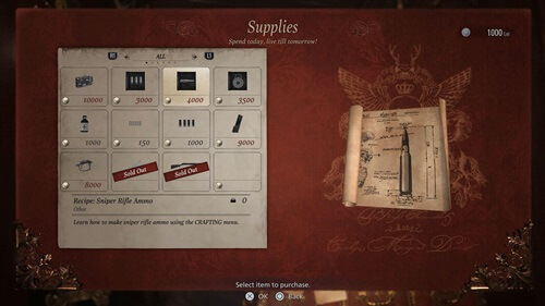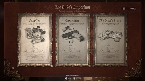 デュークの店では回復薬や武器、弾薬の売買のほか、銃器のカスタマイズやレアアイテムの買い取りなども行っている。詳細は明かされていないが、デュークの店には他にもメニューがあるようだ。
