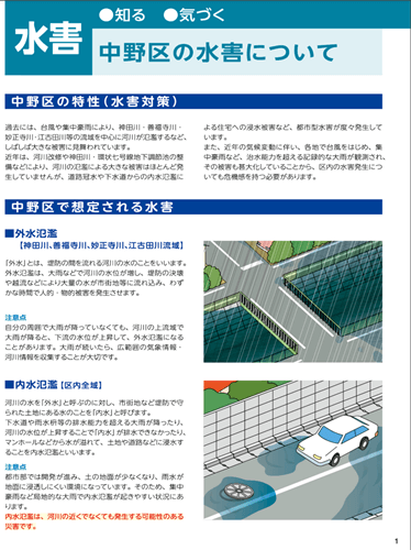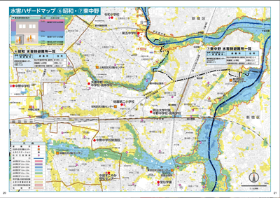 中野区では、隣接する川の氾濫や地震などの災害時に備えてエリア別に「中野区ハザードマップ」を作成しています。