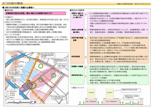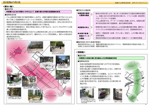 具体的には、武蔵小山駅前と旧平塚小学校跡地をつなぐ『賑わい軸』と、武蔵小山駅と林試の森公園をつなぐ『環境軸』を2つの軸として、2つの軸をつなぐそれぞれの地点を3つの核とした計画です。