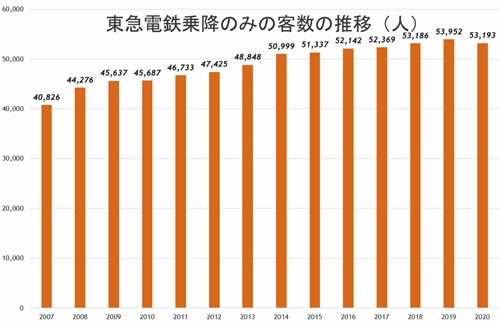 関東交通広告協議会が発表したデータを基に、東急電鉄目黒線の乗降客数の推移を考察していきます。07年以降、武蔵小山で乗降する客数は上昇傾向です。