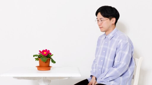眼鏡をかけており、前歯が少し曲がっている成人男性。