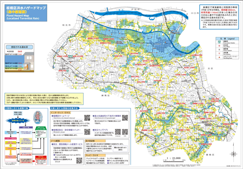 板橋駅がある板橋区は荒川や複数の内水川と隣接しているため、台風や豪雨による川の氾濫が懸念されています。このため、板橋区ではそれぞれの川が氾濫した場合や集中豪雨が発生した場合を想定して、ケース別にハザードマップを作成しています。