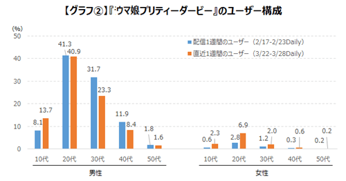 ユーザー構成は、全体の約40%が20代男性。配信初週では男女比95:5だったのに対し、 最新データでは88:12と 女性の割合が上がっている。また、男性30代と40代は減少傾向にあり、その一方で10代男女と20代女性は増加傾向が見られる。